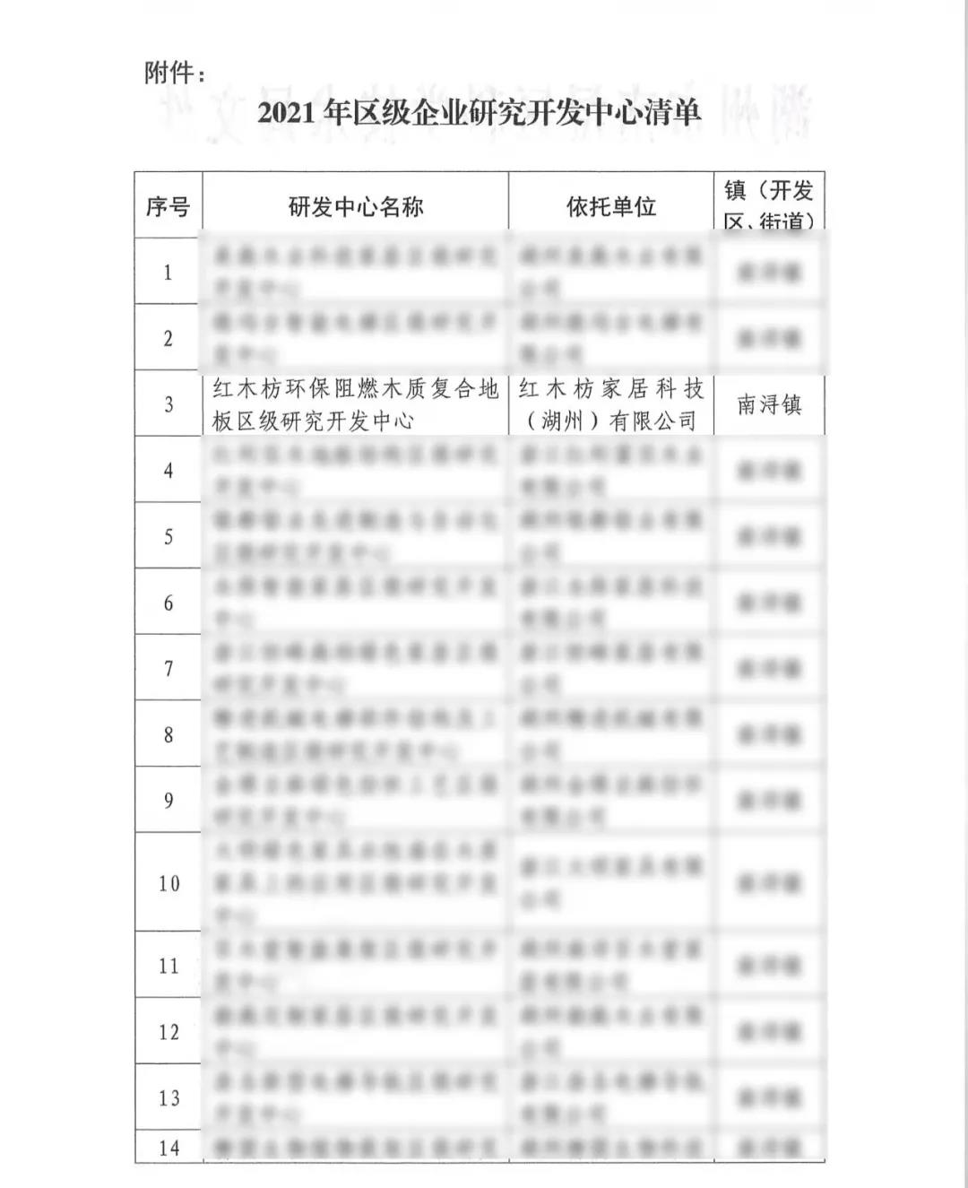 近日,湖州市南潯區科學(xué)技術(shù)局正式下發(fā)《南潯區科學(xué)技術(shù)局關(guān)于認定2021年度區級企業(yè)研究開(kāi)發(fā)中心的通知》(潯科發(fā)〔2021〕6號),根據《湖州市南潯區企業(yè)研究開(kāi)發(fā)中心認定管理辦法》有關(guān)規定,經(jīng)審核認定,紅木枋家居科技(湖州)有限公司地板研發(fā)實(shí)驗室為2021年區級企業(yè)研究開(kāi)發(fā)中心。