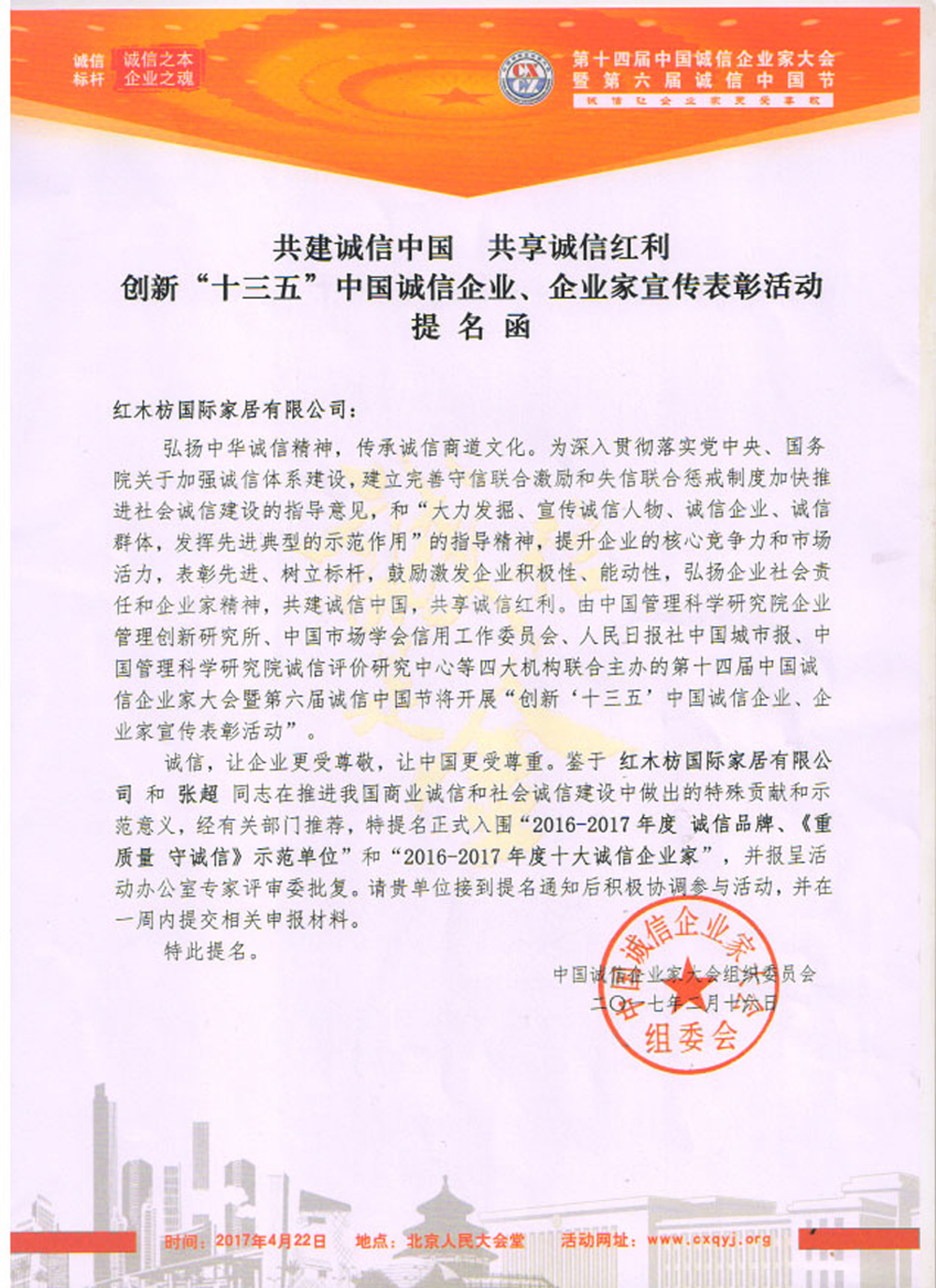 誠信是社會(huì )的基石。誠信企業(yè)是社會(huì )貢獻的重要力量。近日,紅木枋被正式提名為“2016—2017年度誠信品牌”、《重質(zhì)量守誠信》示范單位和“2016—2017年度十大誠信企業(yè)家”,并應邀參加由中國管理科學(xué)研究院企業(yè)管理創(chuàng )新研究所、中國市場(chǎng)學(xué)會(huì )信用工作委員會(huì )、人民日報社中國城市報、中國管理科學(xué)研究院誠信評價(jià)研究中心四大機構聯(lián)合主辦的“第十四屆中國誠信企業(yè)家大會(huì )暨第六屆中國誠信中國節”開(kāi)展的“創(chuàng )新‘十三五’中國誠信企業(yè)、企業(yè)家宣傳表彰活動(dòng)”。