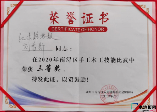 最終,在裁判員嚴格的評分標準下,紅木枋地板的劉春新憑借其扎實(shí)的專(zhuān)業(yè)技能獲得了本次大賽的三等獎。